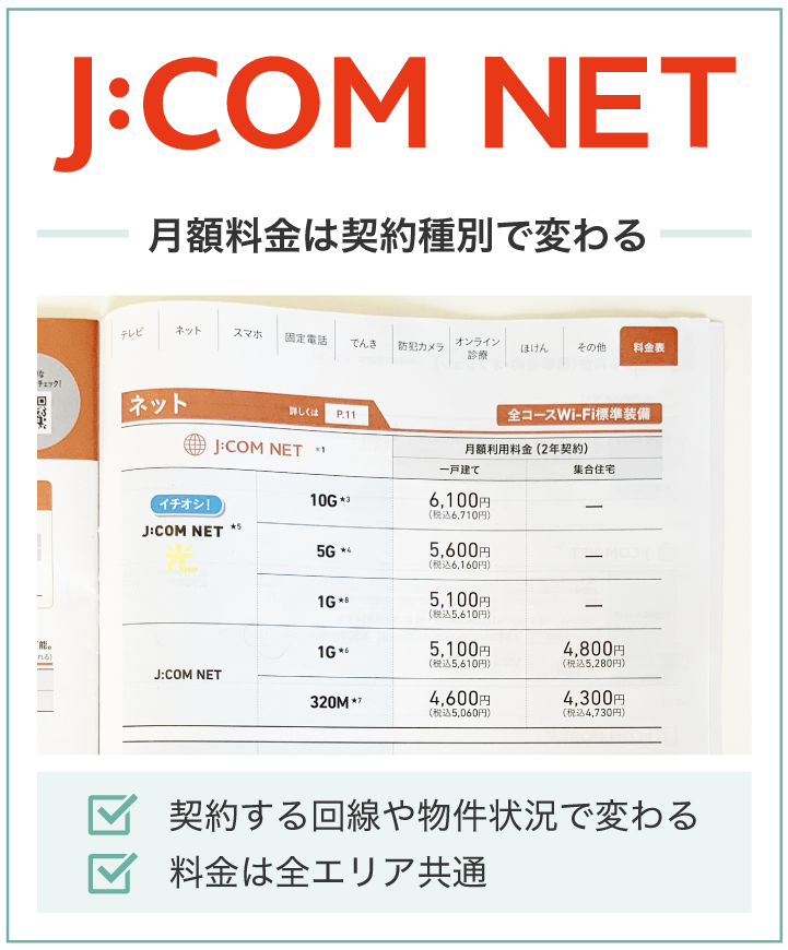 J:COM NETの料金は、契約する回線種別や物件状況に応じて異なります。